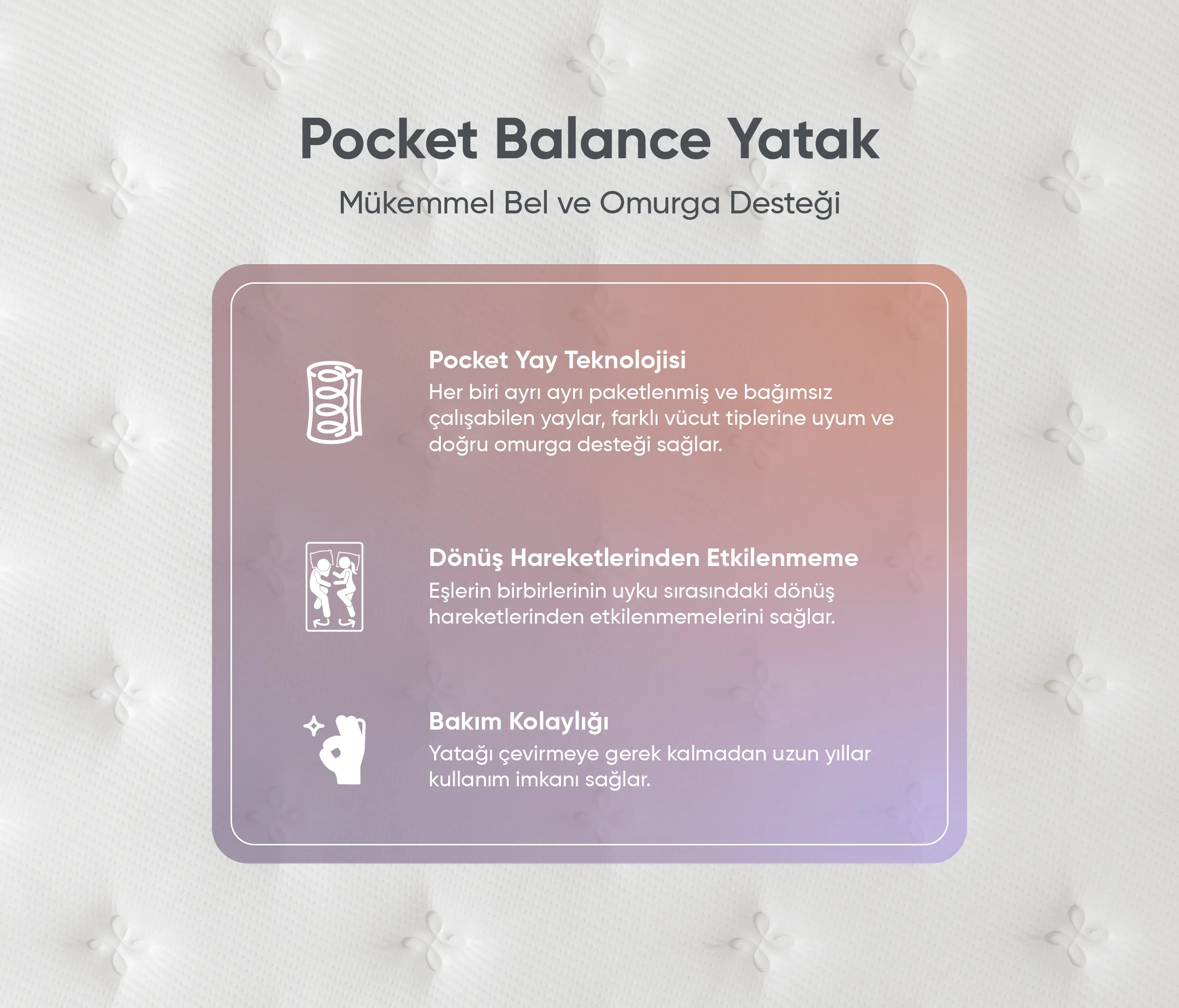 Purotex TreknolojisiKumaşta kullanılan özel aktif bileşenler, yüzeyde istenmeyen oluşumların önüne geçilmesine yardımcı olur. Uyku ortamının daha ferah ve temiz kalmasına yardımcı olur.